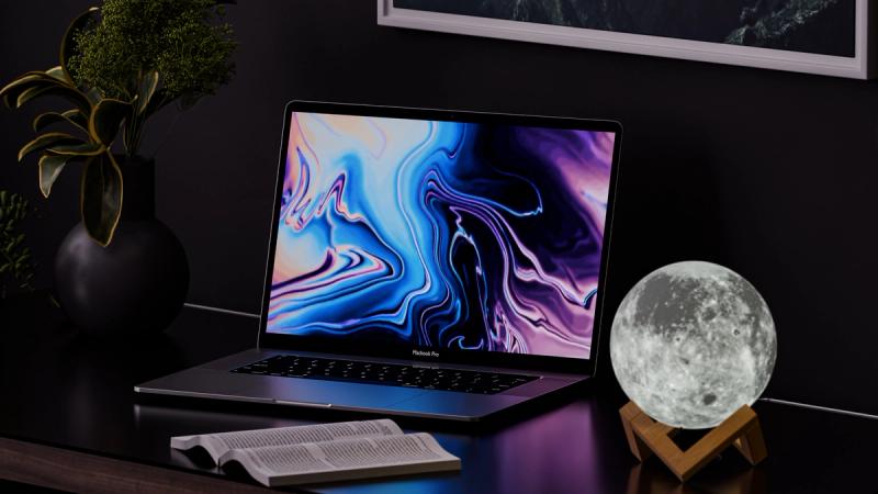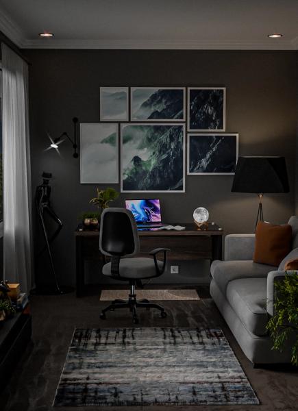 A stylish home office setup featuring a dark accent wall adorned with mountain-themed art. The desk setup includes a laptop, globe lamp, and plants, while a gray sofa with orange cushions and a modern black floor lamp add warmth and comfort to the space. A textured rug ties the room together, creating a serene and inspiring workspace.