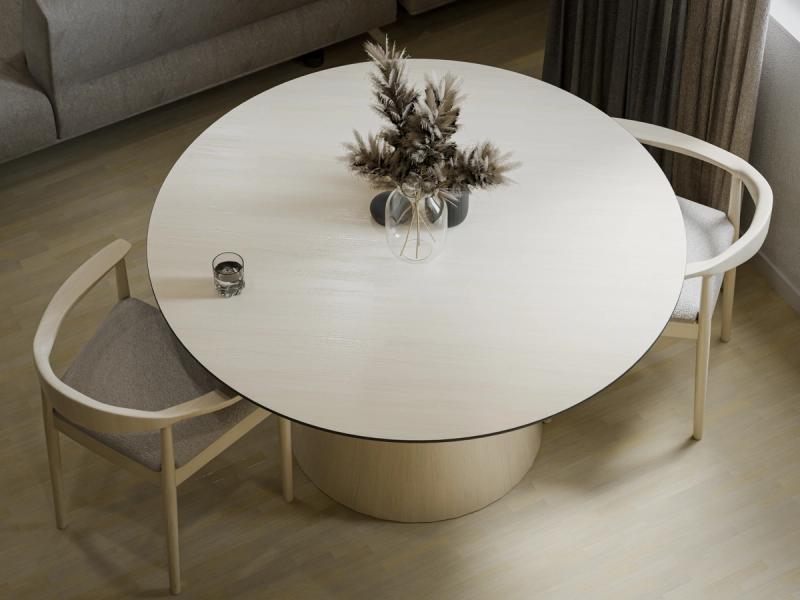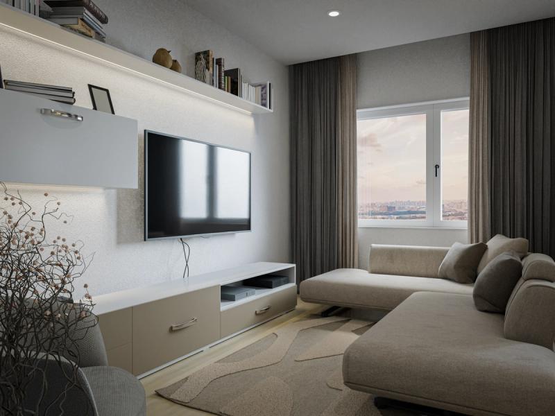 This 3D visualization highlights a contemporary living space seamlessly integrated with a compact kitchen. The minimalist design emphasizes functionality and style, featuring a neutral-toned sofa, elegant dining setup, and a sleek kitchen with white cabinetry and warm accent lighting. The open-plan layout is designed to maximize space efficiency while maintaining a cozy and inviting ambiance. Perfect for modern living, this design combines practicality with aesthetics for an effortless lifestyle.