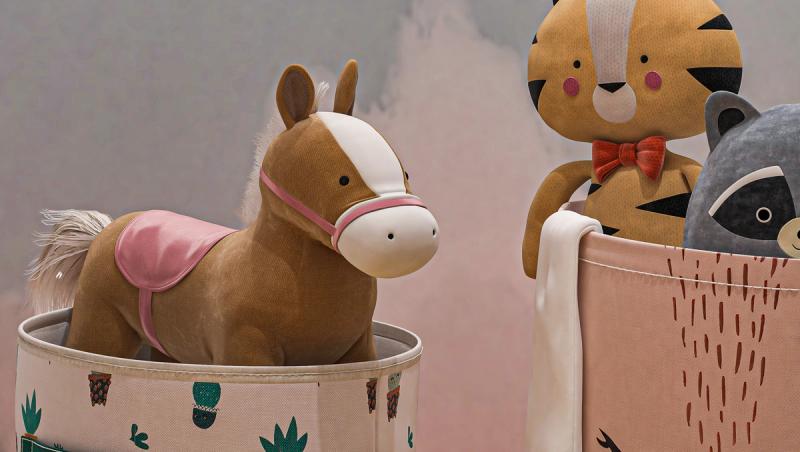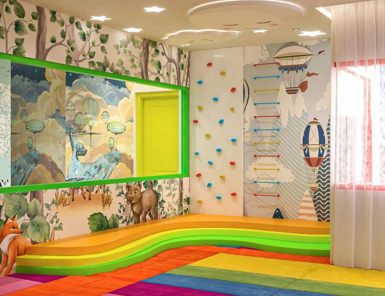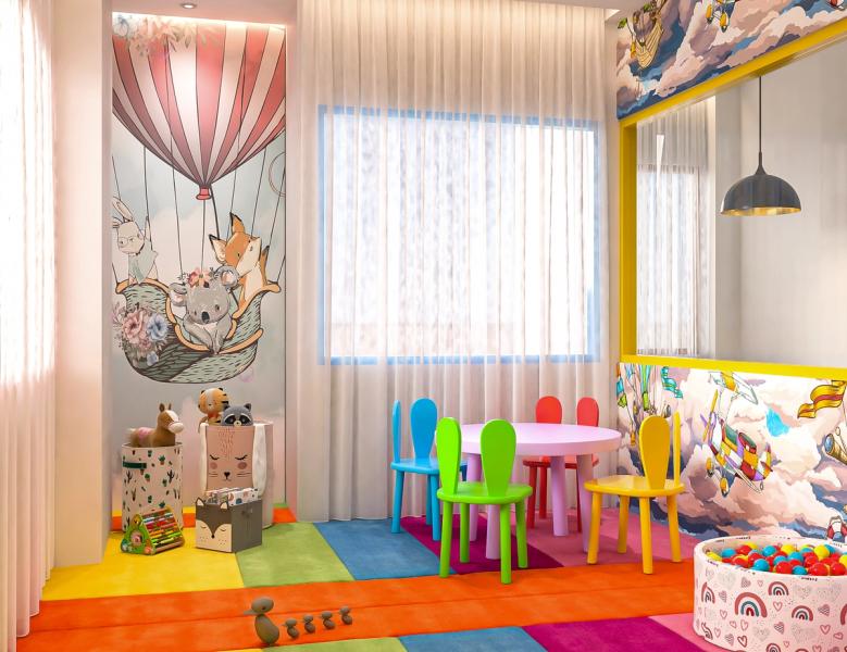 A bright and cheerful kids' playroom filled with colorful furniture and playful wall art. The room features a round table with rainbow-colored chairs, a soft mat with vivid patterns, and a ball pit. The walls are decorated with charming illustrations of animals in hot air balloons, creating a fun and imaginative space perfect for young children.